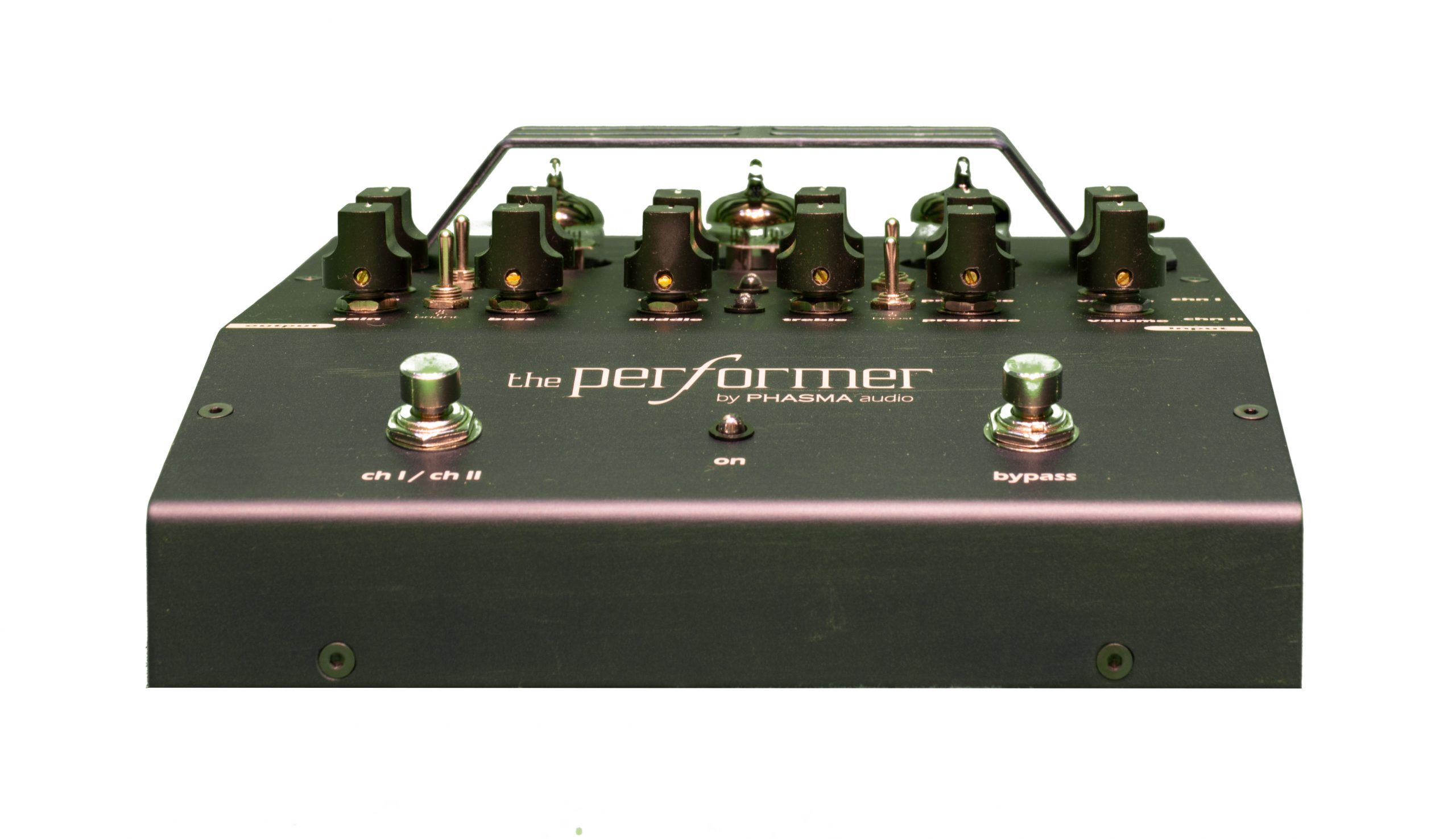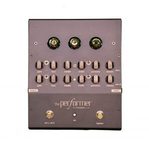 The Performer is an all tube distortion pedal for electric guitar. Two separate channels allow for maximum flexibility and performance. Each channel features independent controls, including a detailed equalizer section (bass, midrange, treble & presence), two position bright switches, gain boost, gain and volume controls. The design of the circuit offers great flexibility, allowing better matching with various guitars and amplifiers. A dedicated part of the circuit ensures noise free channel switching.